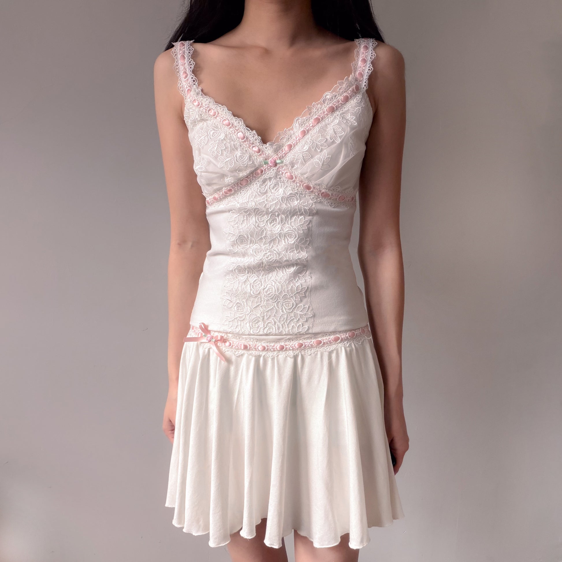 A sweet coquette top crafted from thick, stretchy ponte fabric and overlaid with embroidered floral lace. It’s detailed with a hand-strung ballet pink ribbon through white lace trim and finished with a delicate rose appliqué. Pairs perfectly with the Angel Skirt as a matching set, though it’s just as darling styled on its own with any coquette-inspired look.