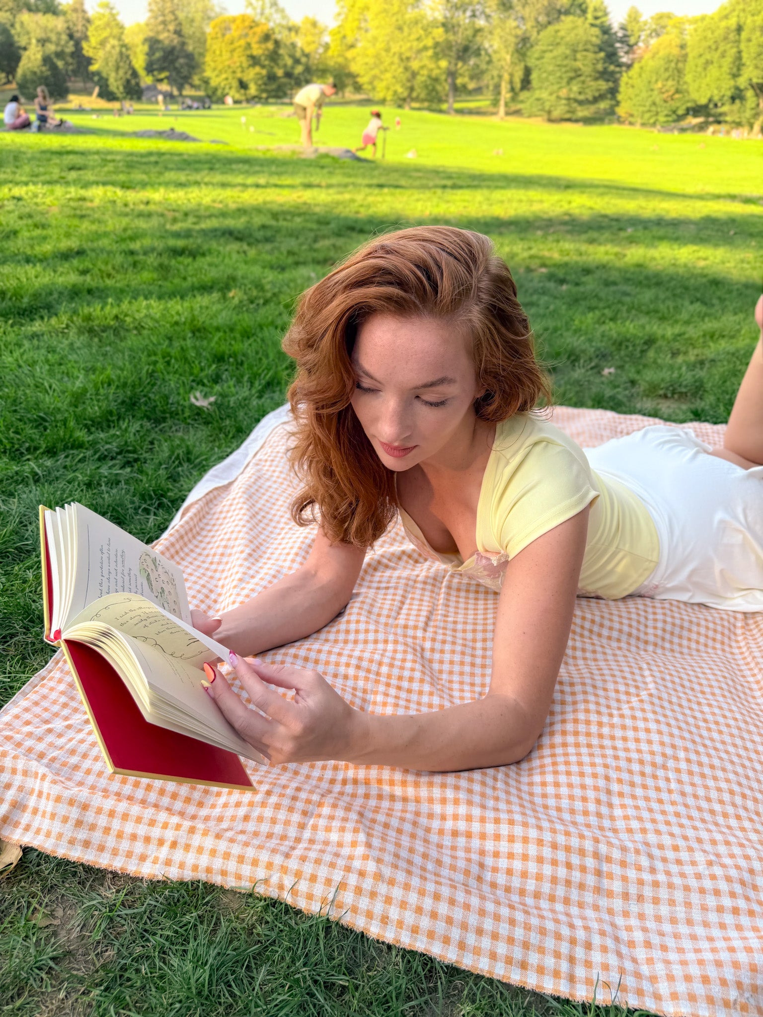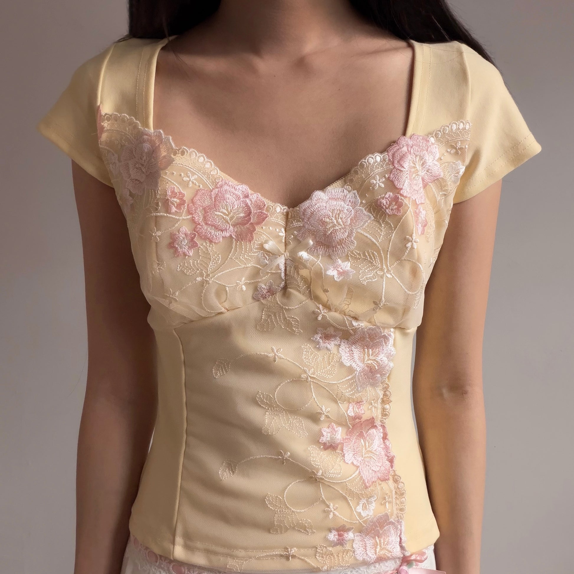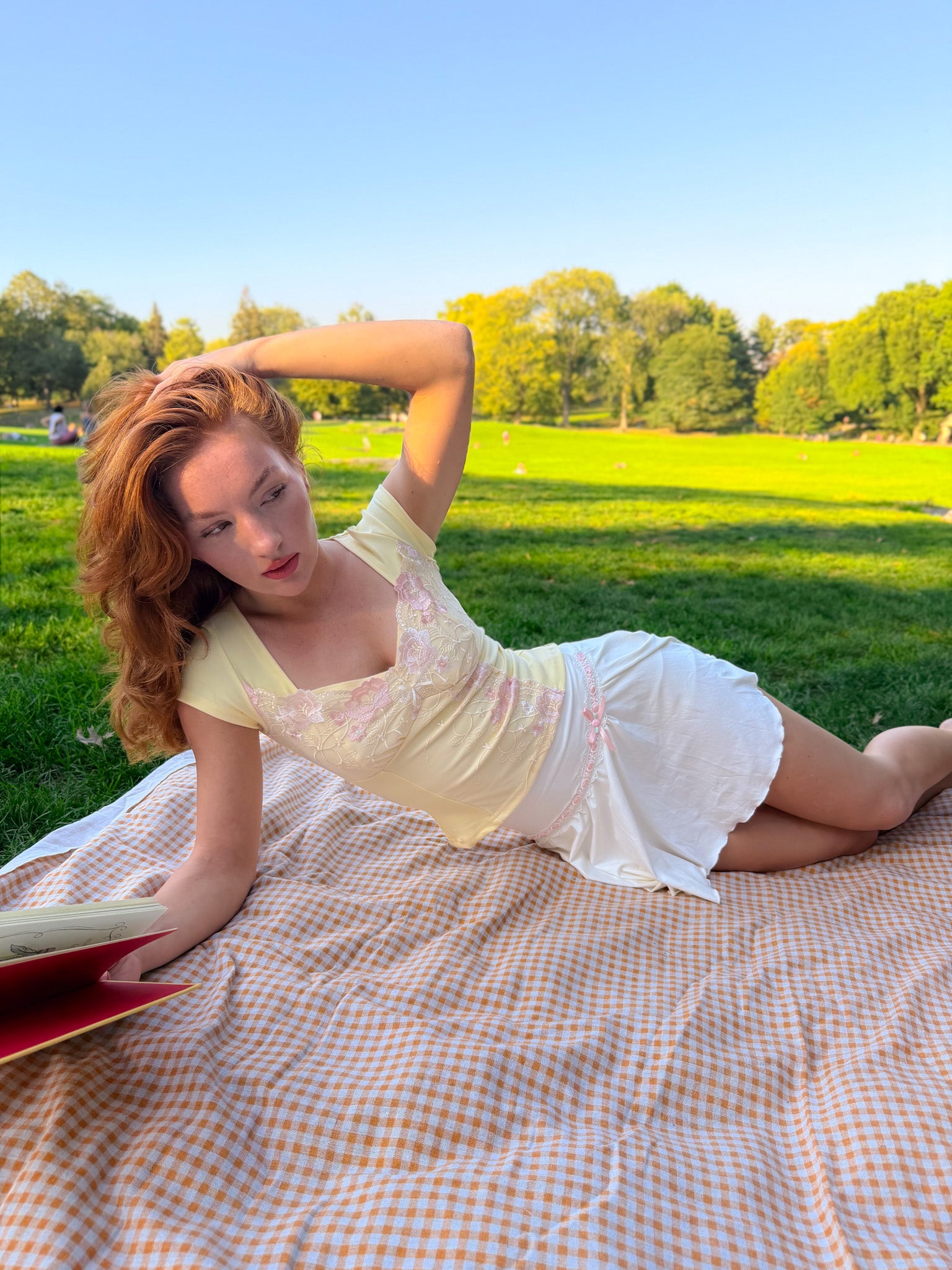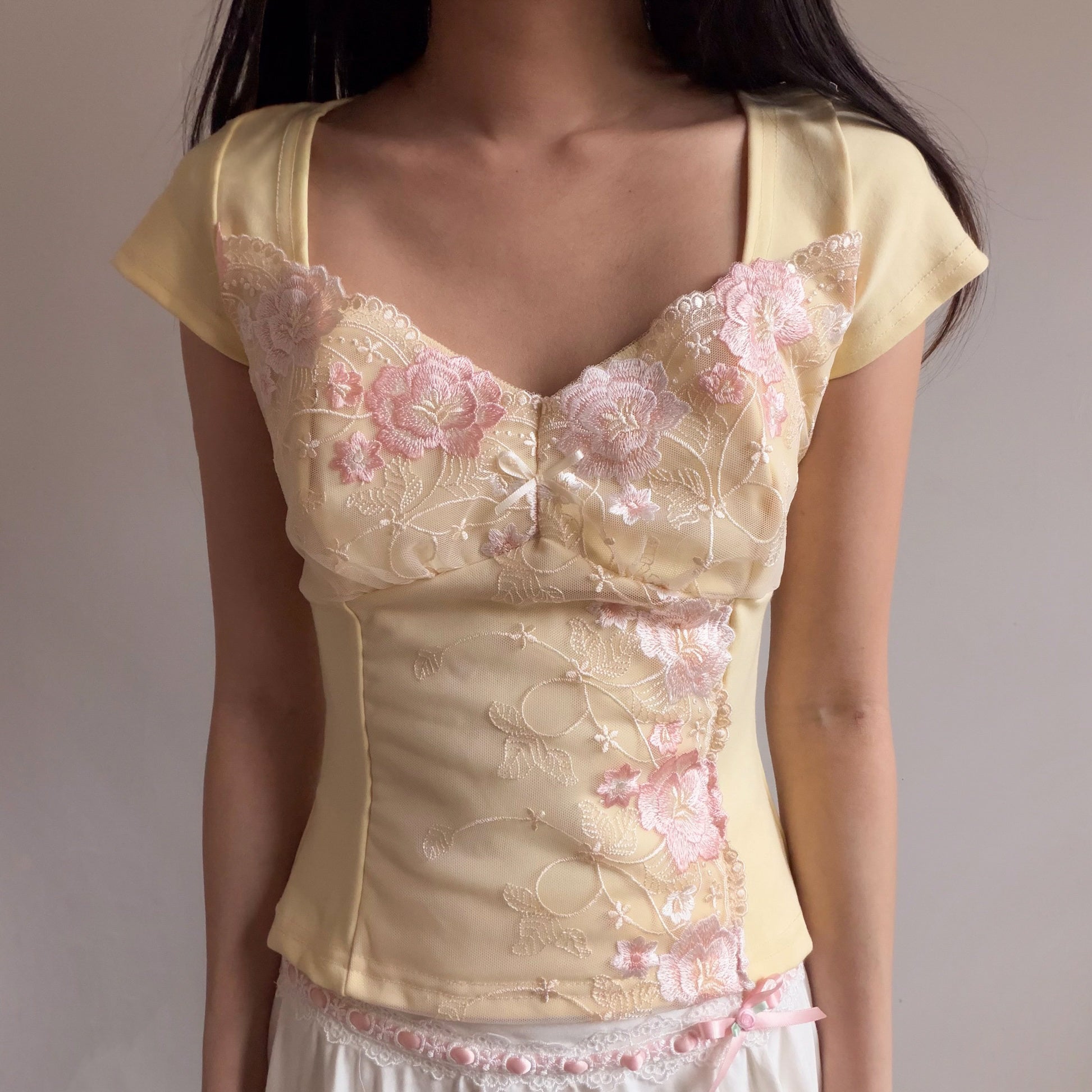 This handmade top is inspired by golden hour—the time of day when the sun is soft, and a warm golden glow transforms the world into a breathtakingly beautiful and tranquil scene. The embroidered roses along with the yellow fabric illustrates a garden touched by the sunset. The fabric is thick, the lace is soft, and a touch of romance is added with an ivory bow.