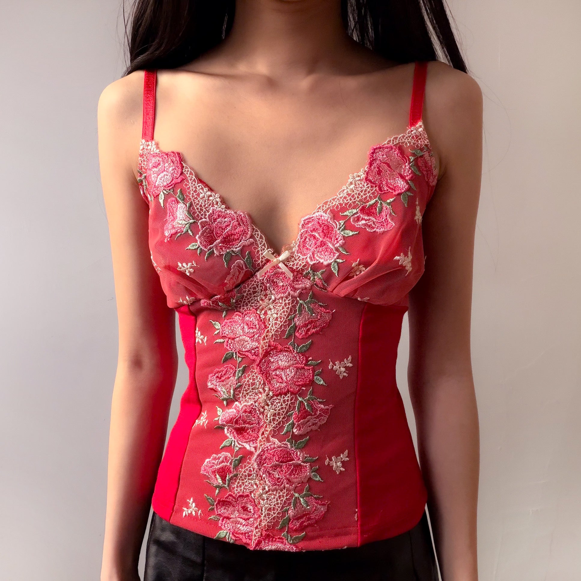 A scarlet lace top designed to feel like lingerie, styled to live beyond the bedroom. This fitted silhouette features embroidered roses and light gold decorative vines, a plunging neckline, heart shaped strap sliders, and a dainty bow at the center, drawing the eye in. Sculpting side panels cinch the waist, while the vertical lace placement elongates the body for a sultry, corset-inspired look. Softly provocative, unapologetically feminine, romantic, and bold, this piece pairs effortlessly with any bottom and elevates your outfit.